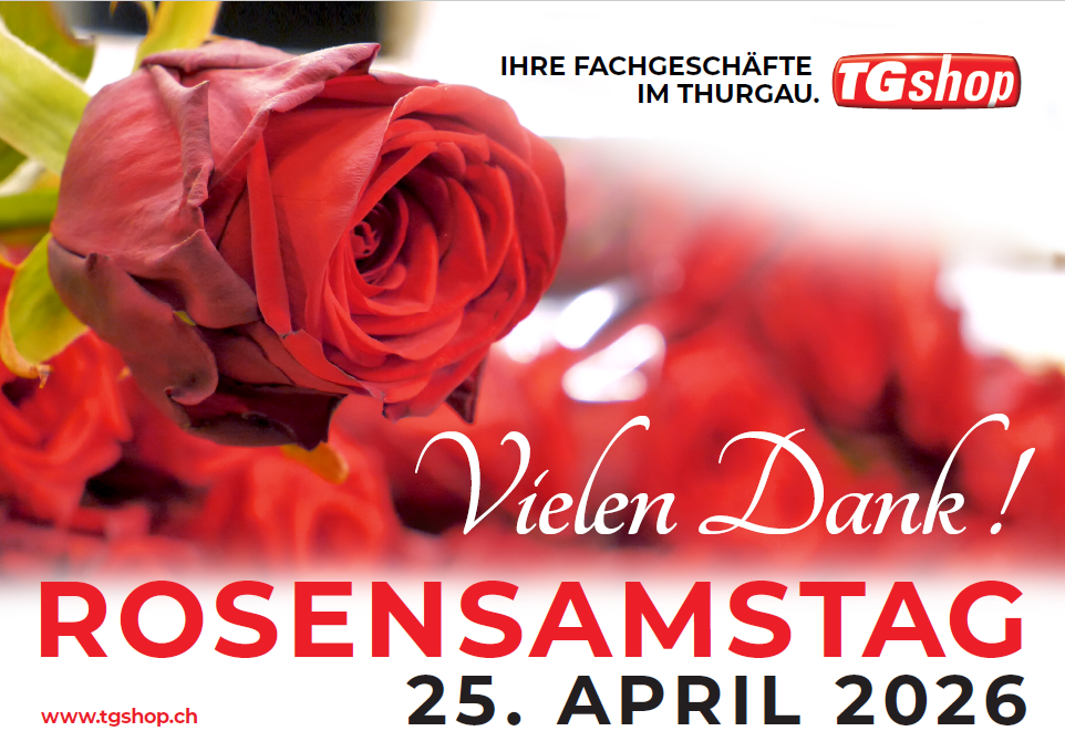 Am Samstag, 25. April 2026, ist es wieder so weit: Der beliebte Rosensamstag findet statt! Als Dankeschön für Ihre Treue und die Unterstützung des regionalen Detailhandels erhalten unsere Kundinnen und Kunden an diesem Tag eine Rose – solange der Vorrat reicht. Kommen Sie vorbei, lassen Sie sich überraschen und geniessen Sie den besonderen Einkaufstag bei uns im Thurgau. Wir freuen uns auf Ihren Besuch!
